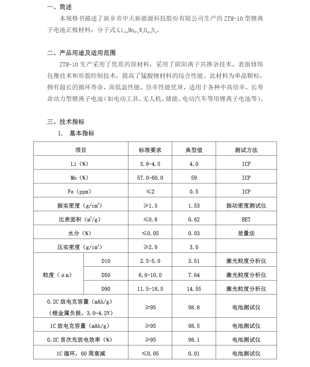ZTM-10生產(chǎn)采用了的原材料,使用陰陽(yáng)離子共摻雜技術(shù)、表面修飾包覆技術(shù)和形貌控制技術(shù),提高了錳酸鋰材料的綜合性能。此材料為大單晶顆粒,擁有超長(zhǎng)的循環(huán)壽命,高低溫性能、倍率性能,適用于各種中高倍率、長(zhǎng)壽命動(dòng)力型鋰離子電池(如儲(chǔ)能系統(tǒng)、電動(dòng)汽車、電動(dòng)工具等用鋰離子電池等)。